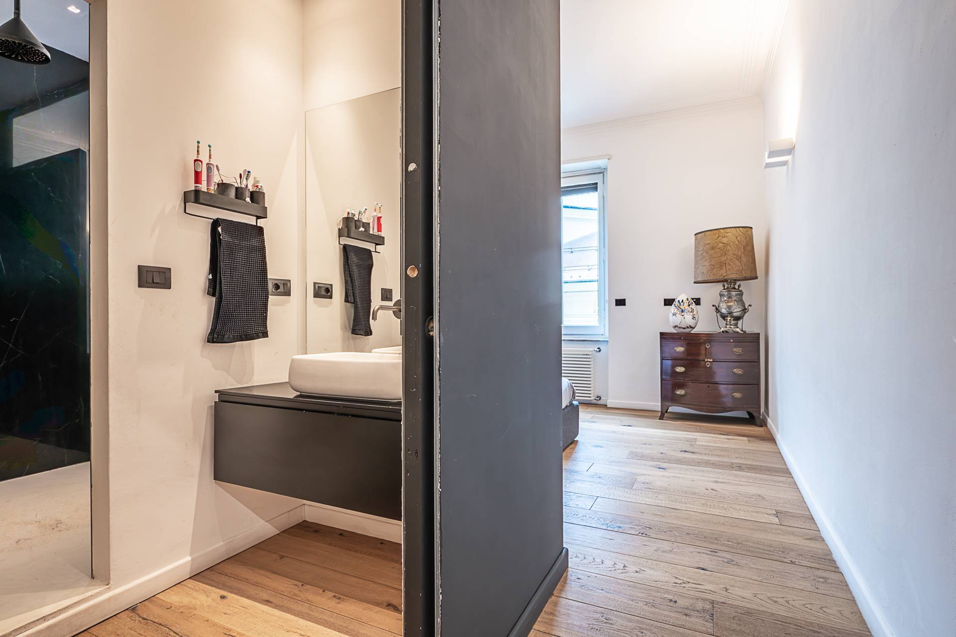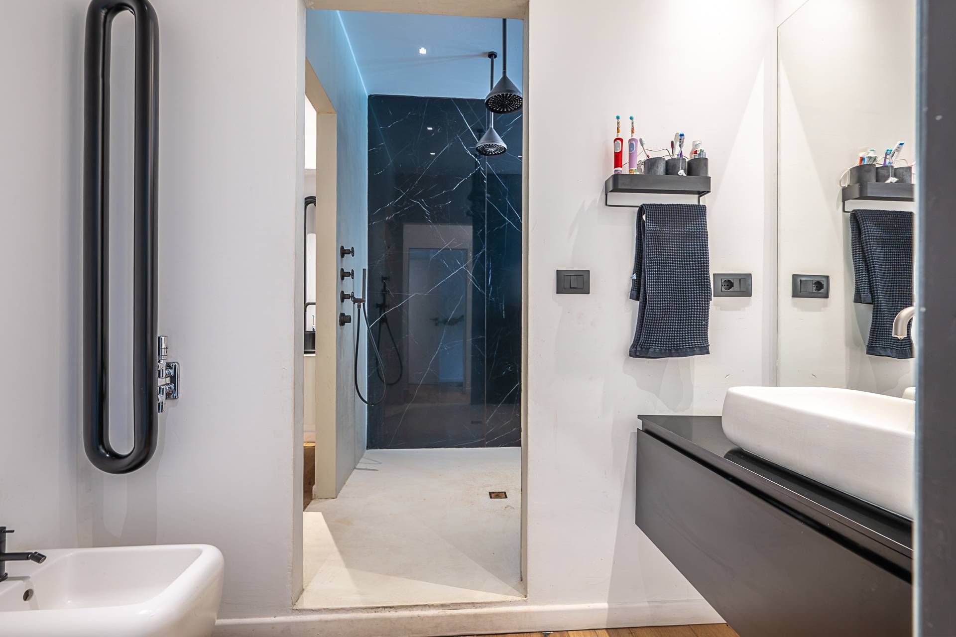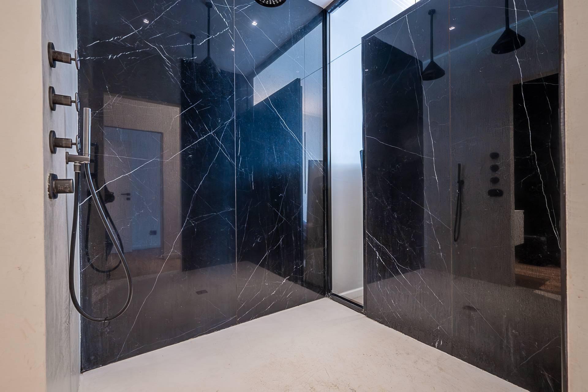 Completano la proprietà due bagni, rifiniti con materiali ricercati e soluzioni moderne: uno con ampia doccia walk-in dal design contemporaneo e rivestimenti effetto marmo scuro, l'altro funzionale e ben organizzato. Cantina di pertinenza.