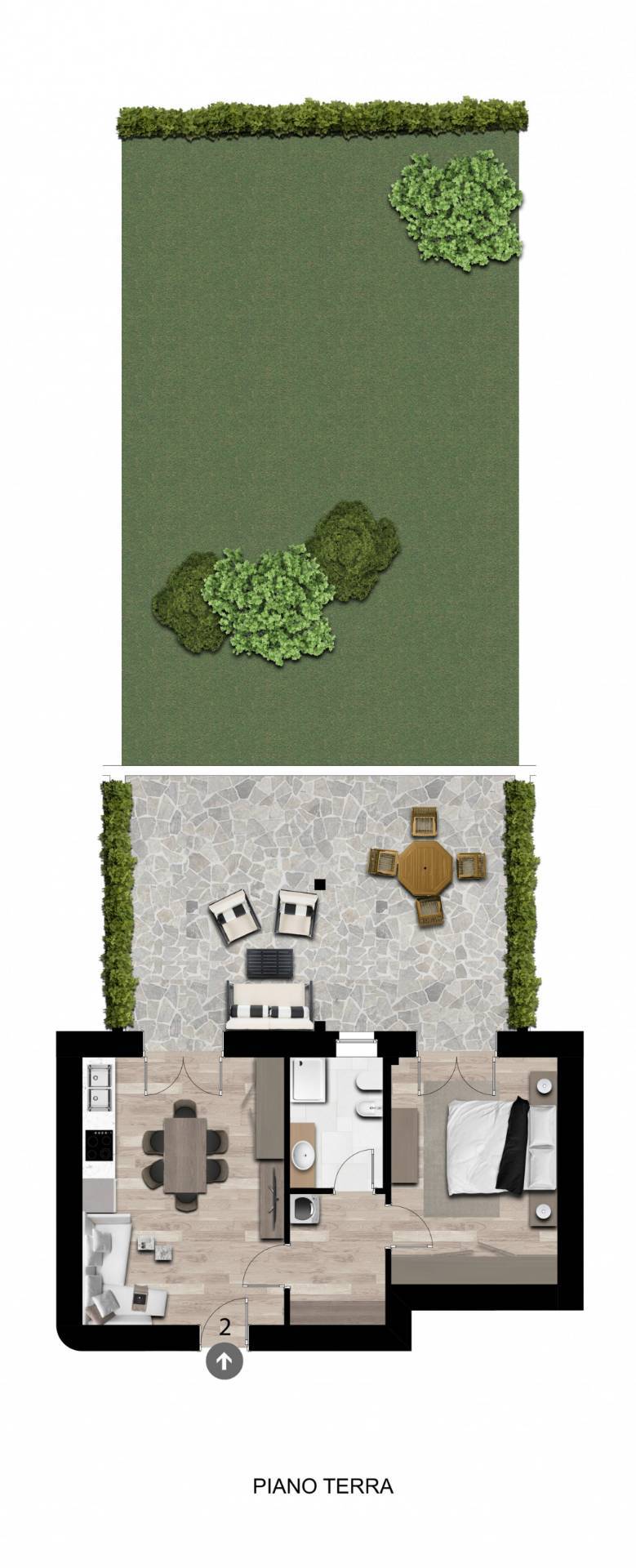 L'ingresso si apre su una luminosa zona giorno con cucina a vista e affaccio diretto al giardino che rappresenta un vero valore aggiunto. La zona notte comprende una spaziosa camera matrimoniale e un bagno finestrato completo di lavanderia, progettato per offrire comfort e funzionalità. Gli ambienti sono studiati per garantire benessere abitativo, praticità e una distribuzione ottimale degli spazi.