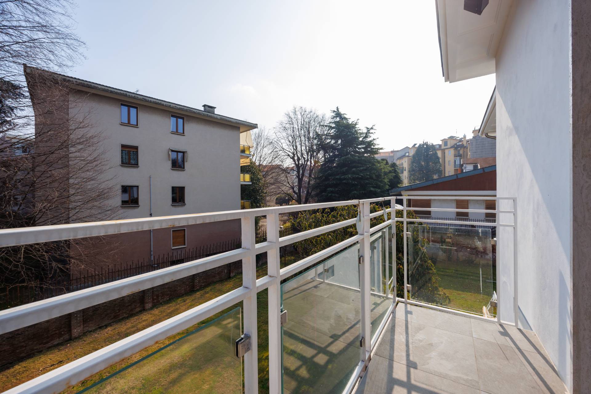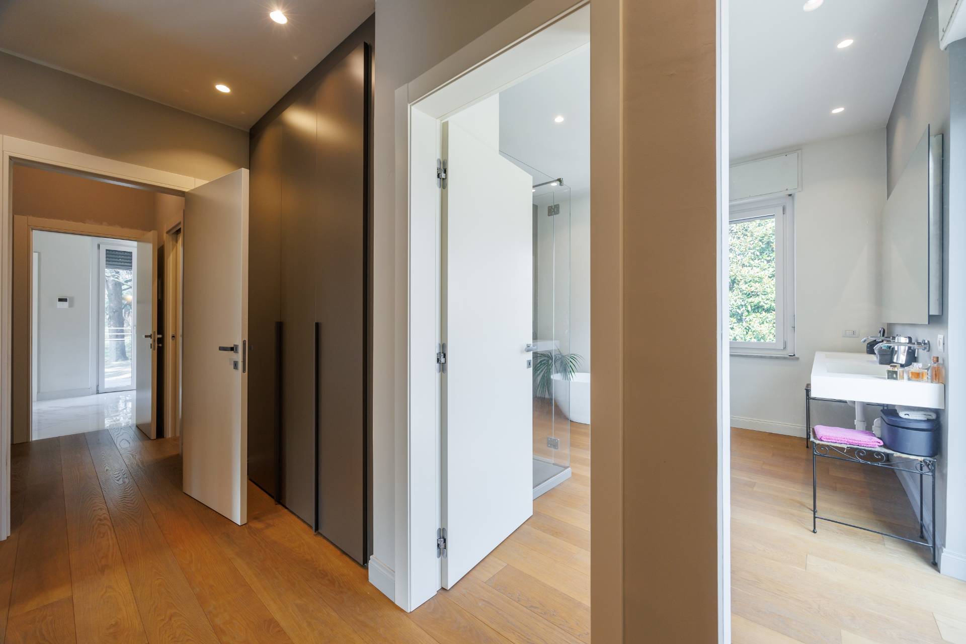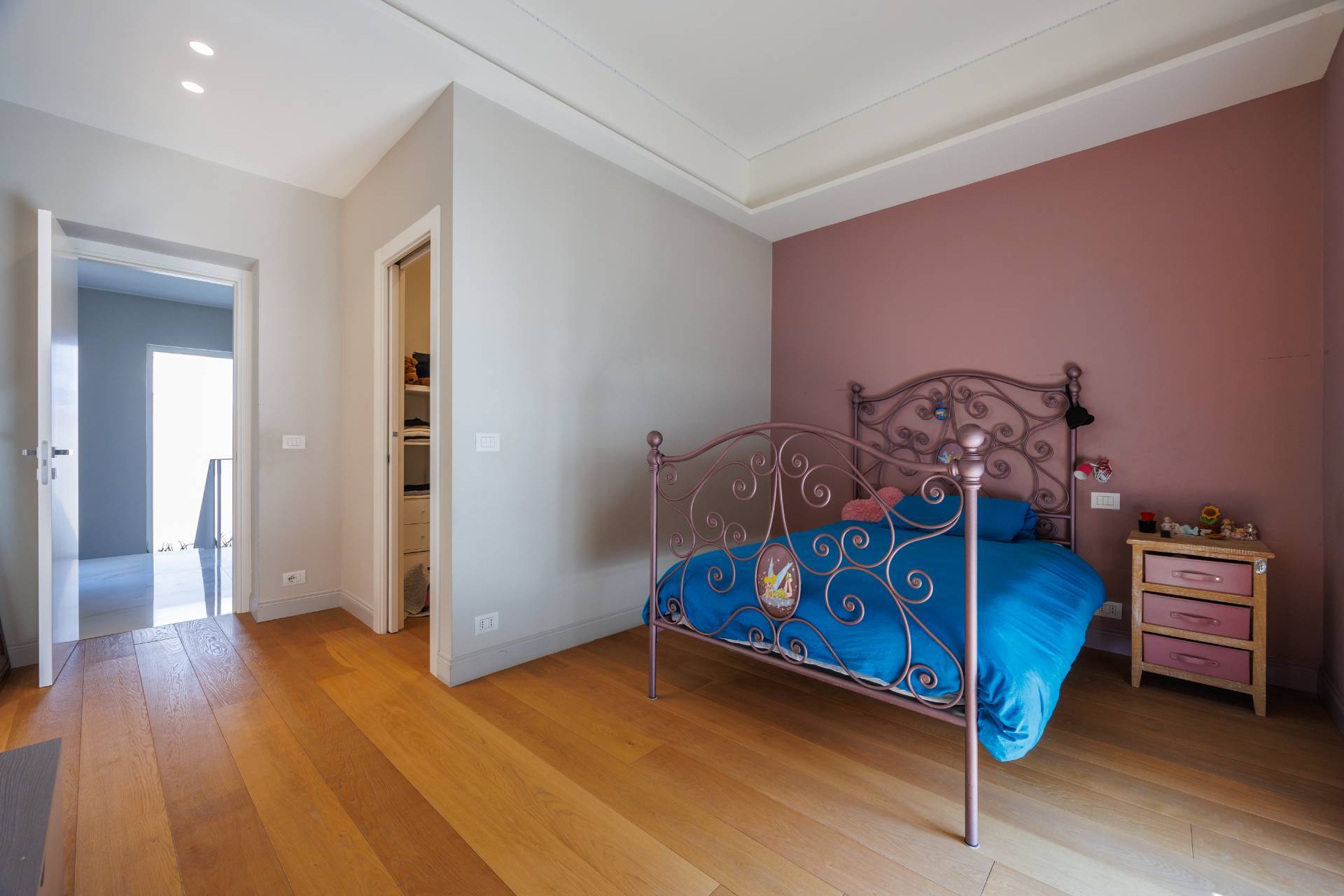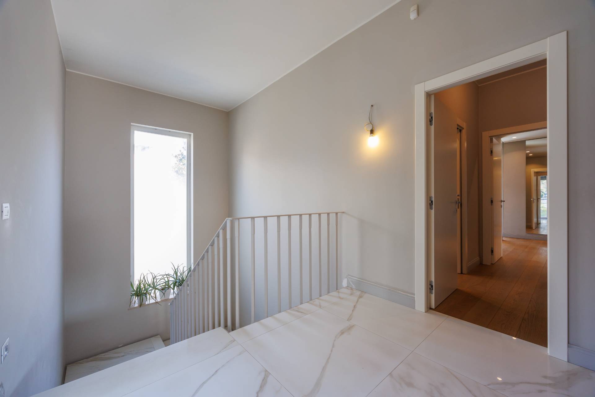 Al piano primo la scala interna conduce alla zona notte composta da tre camere da letto, guardaroba, studio/spazio polifunzionale, due bagni e balconi su più lati.