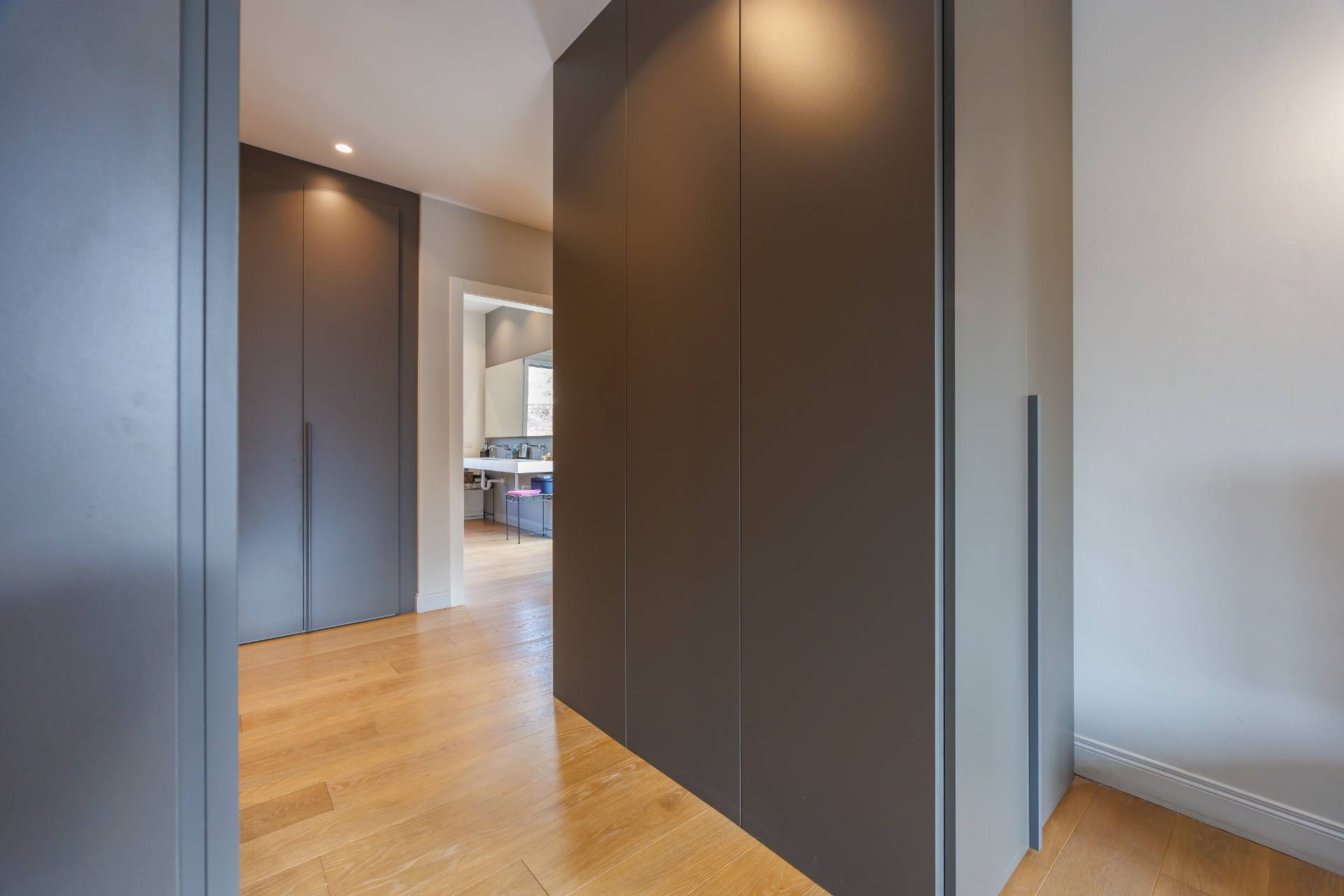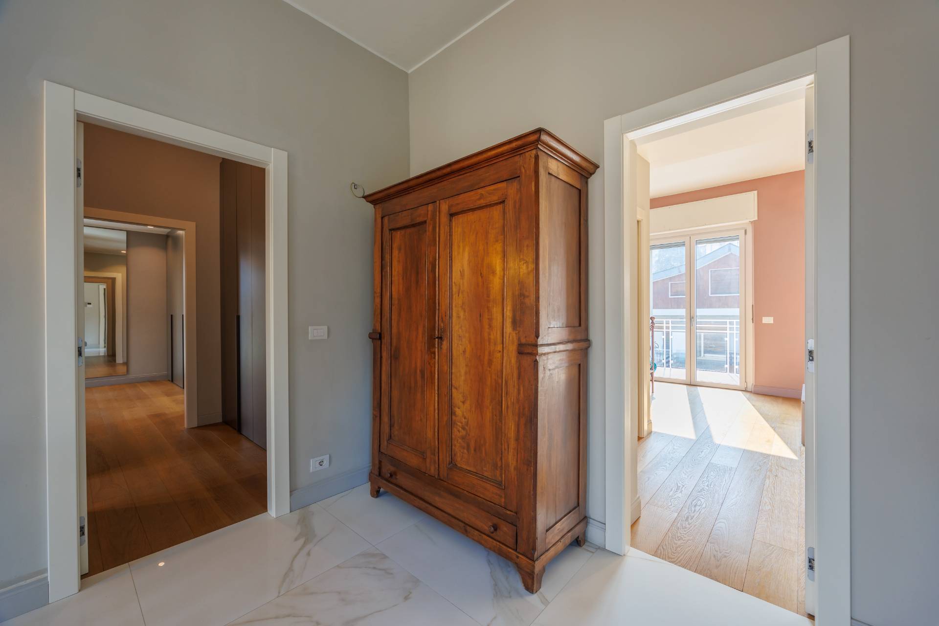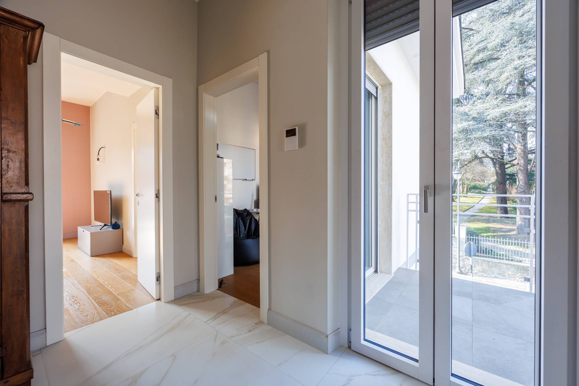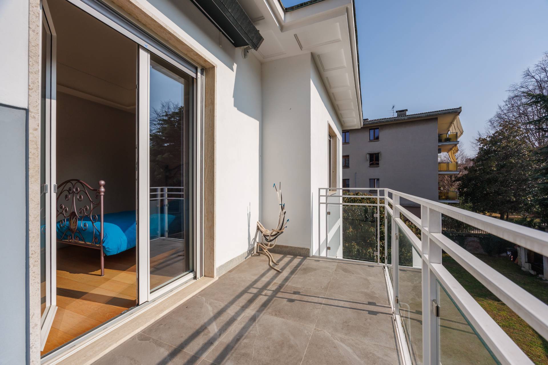 Al piano primo la scala interna conduce alla zona notte composta da tre camere da letto, guardaroba, studio/spazio polifunzionale, due bagni e balconi su più lati.