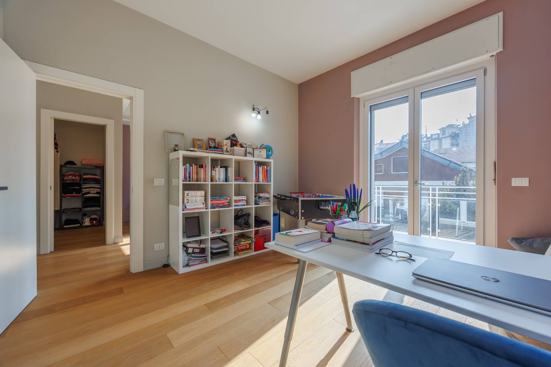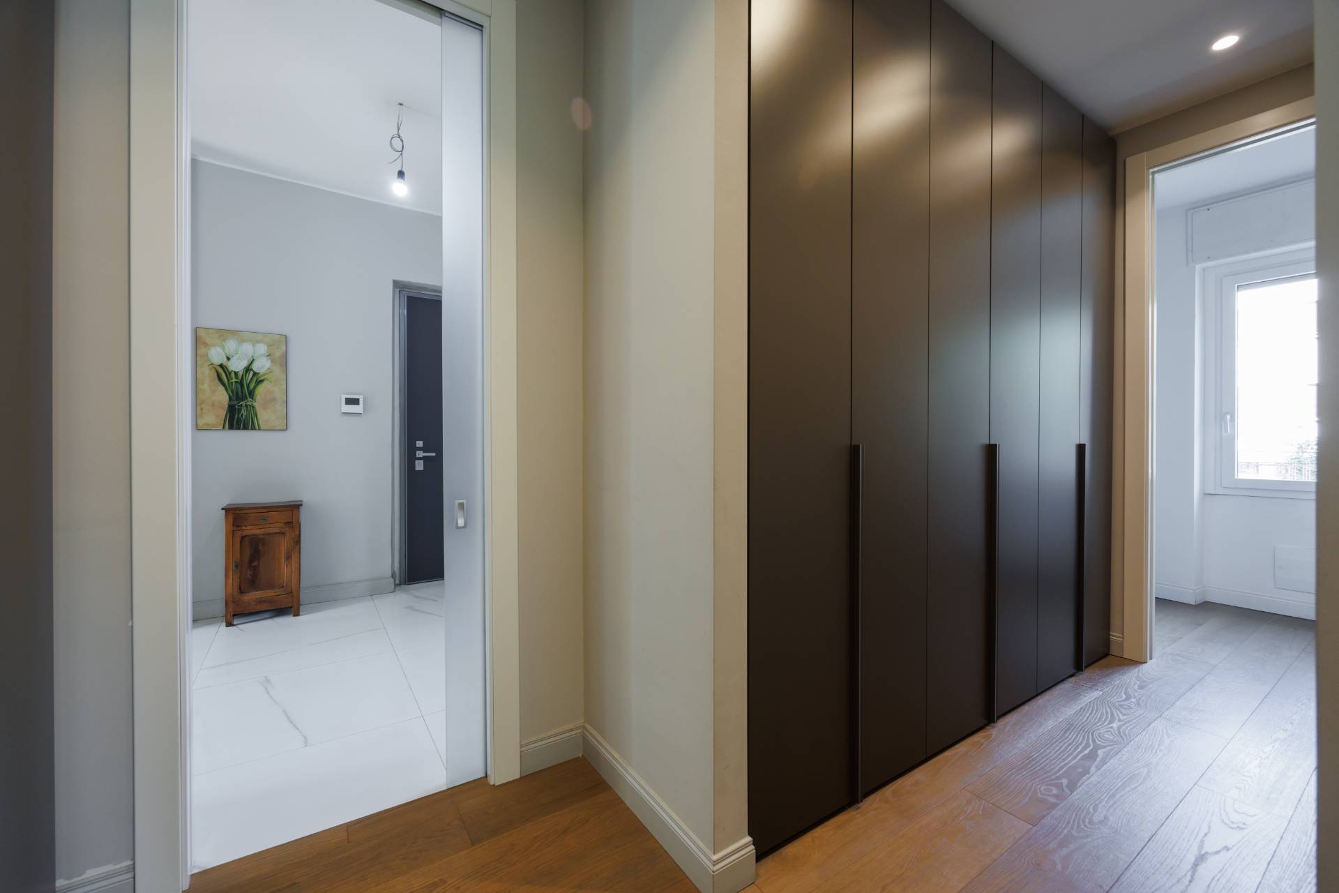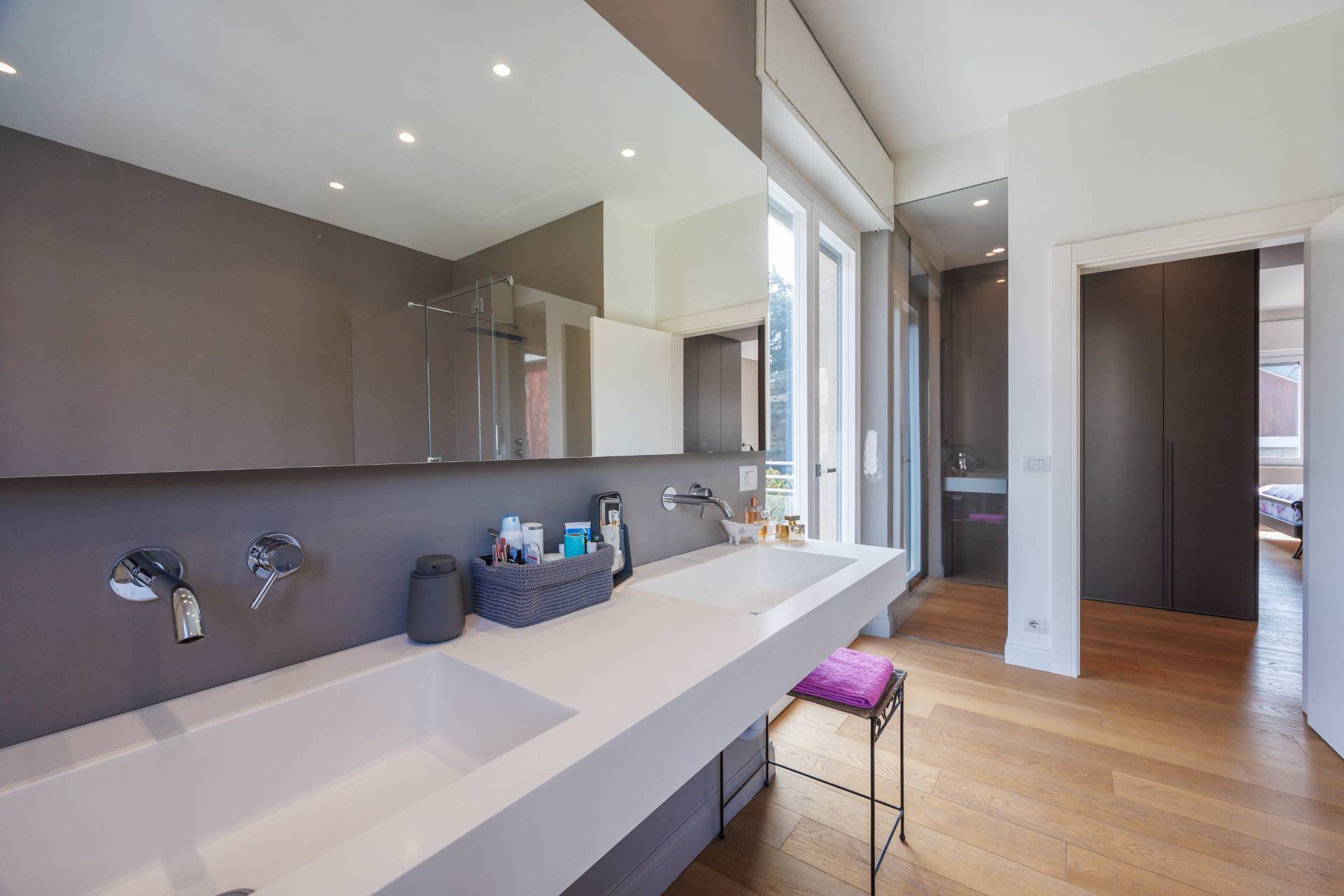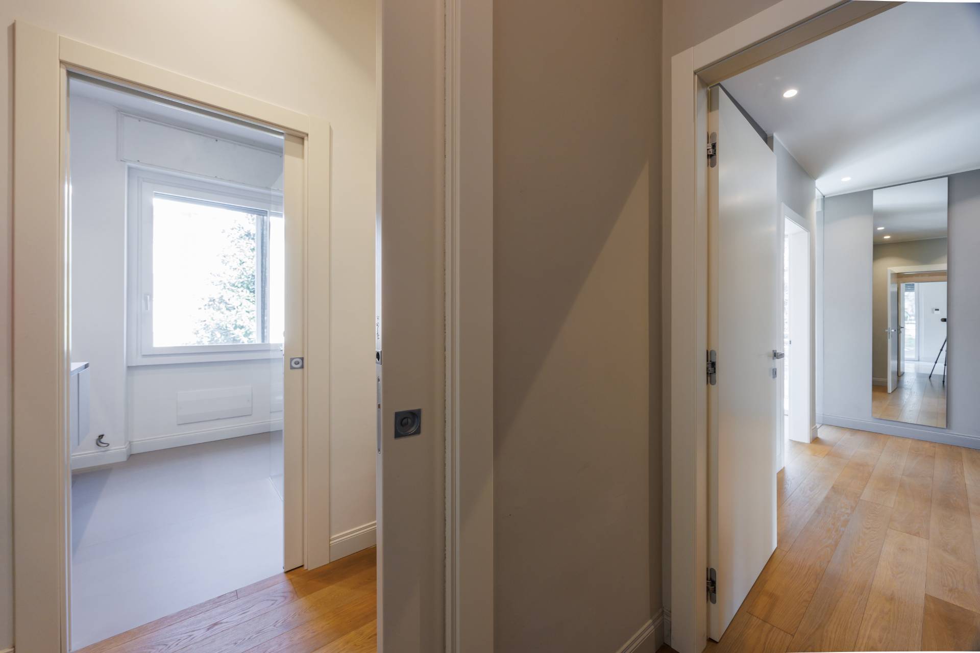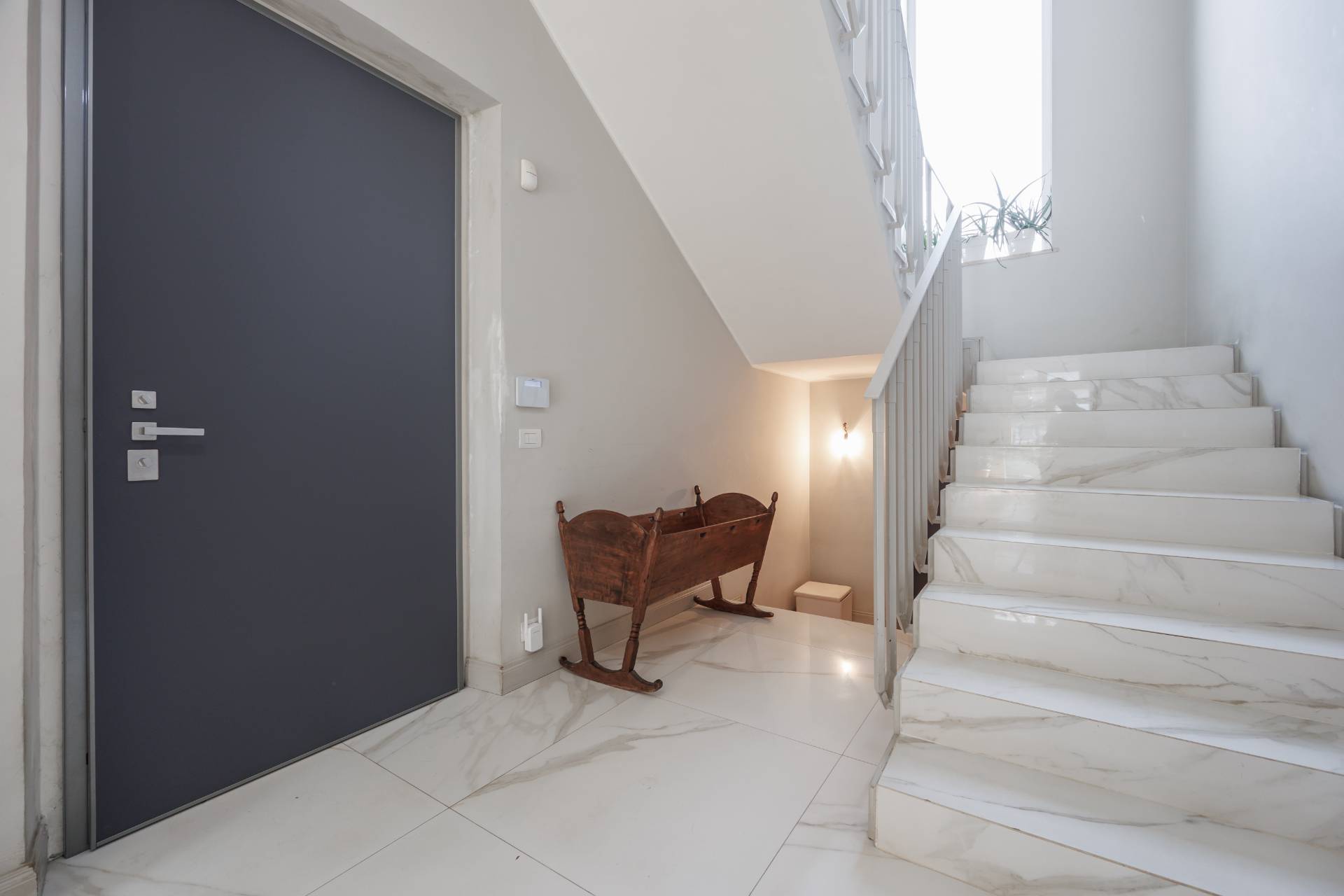 Al piano primo la scala interna conduce alla zona notte composta da tre camere da letto, guardaroba, studio/spazio polifunzionale, due bagni e balconi su più lati.