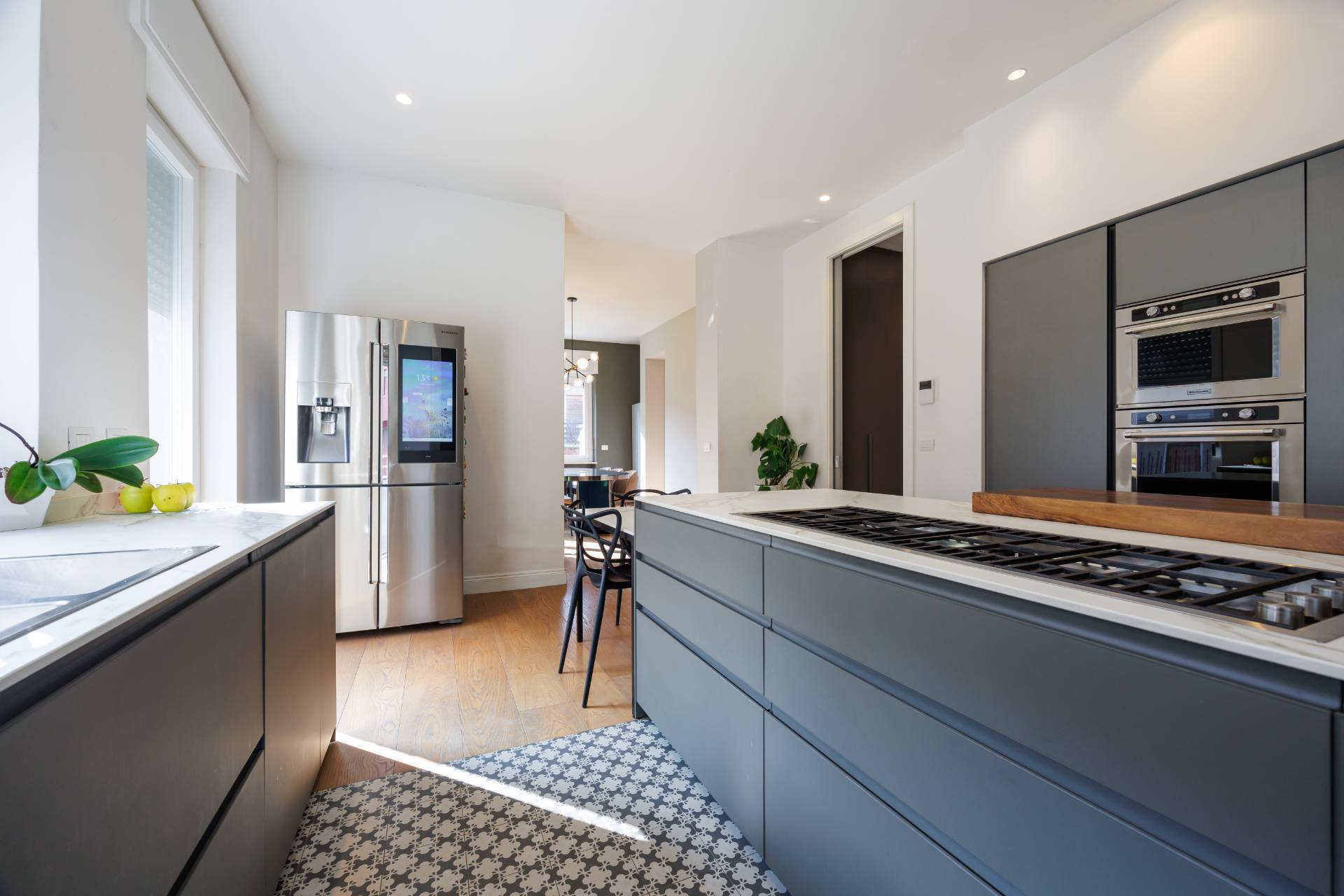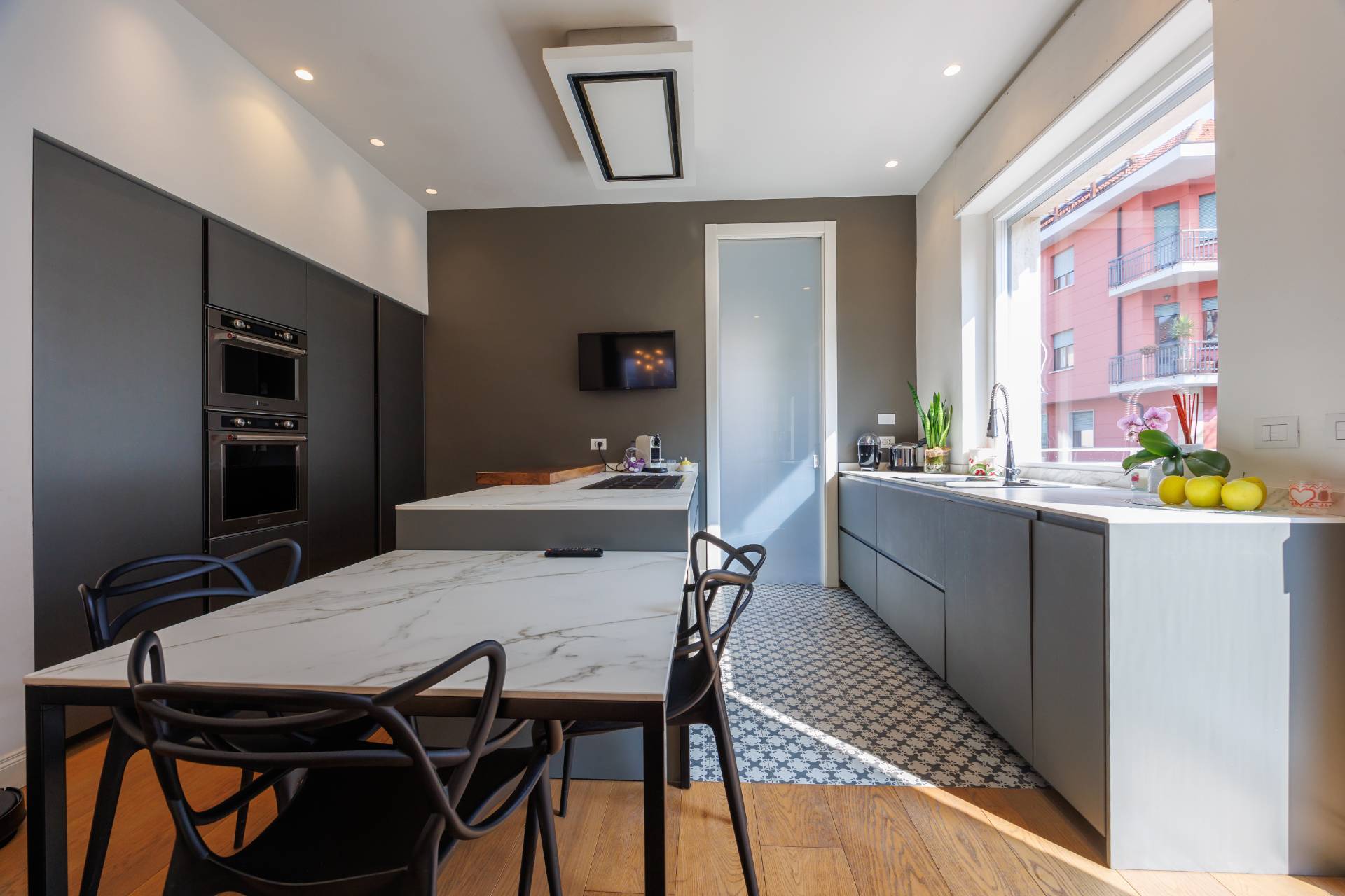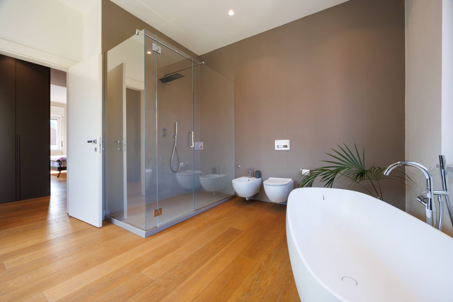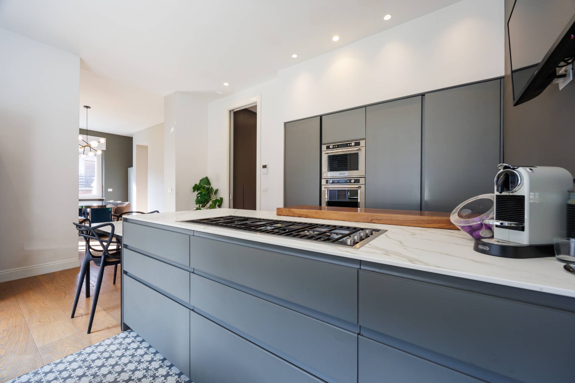 Al piano primo la scala interna conduce alla zona notte composta da tre camere da letto, guardaroba, studio/spazio polifunzionale, due bagni e balconi su più lati.