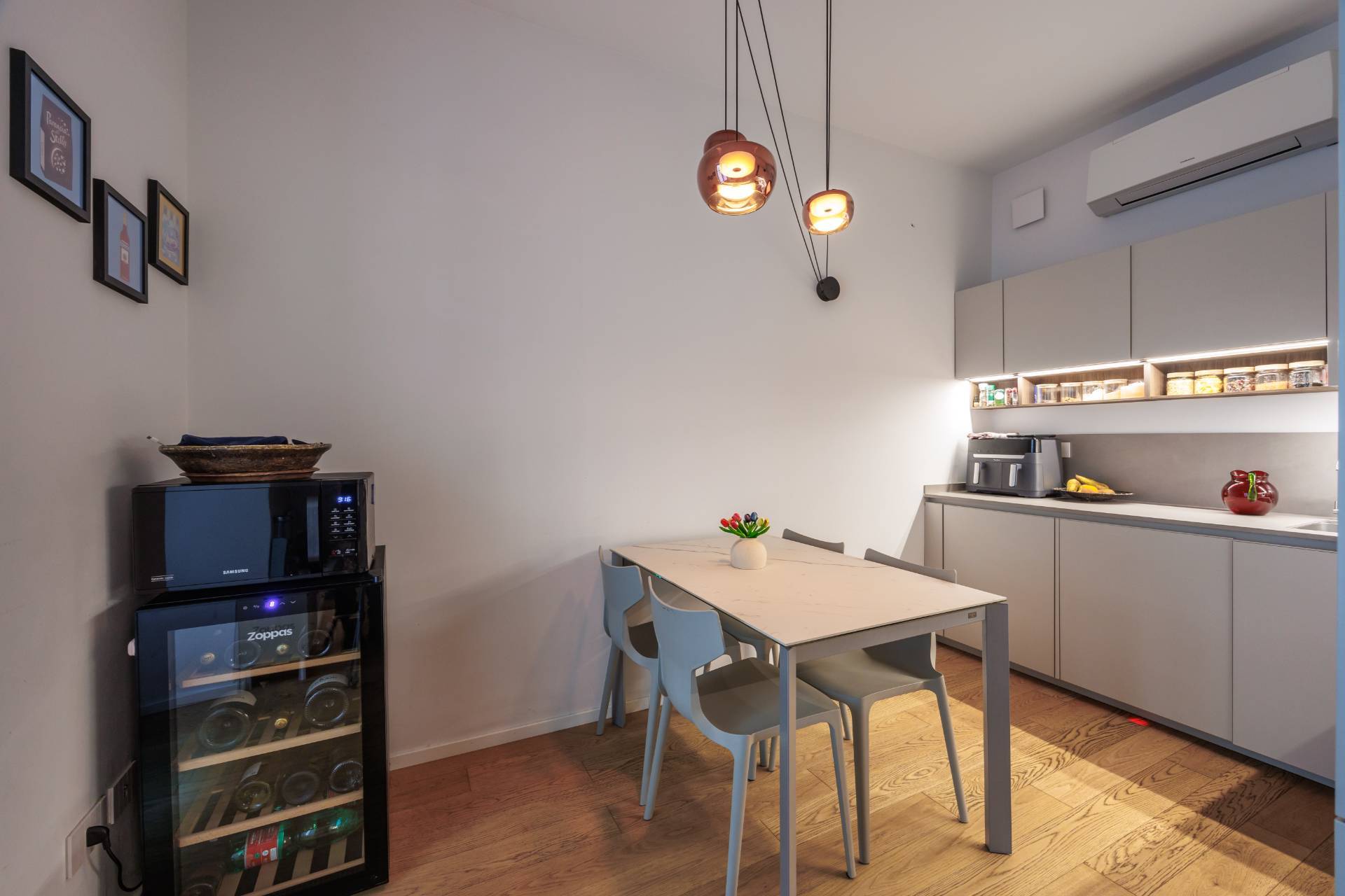 L'immobile si apre su un'accogliente zona giorno con soggiorno luminoso, affiancato da una cucina abitabile; la zona notte comprende due camere da letto e doppi servizi, progettati con materiali e finiture di pregio.