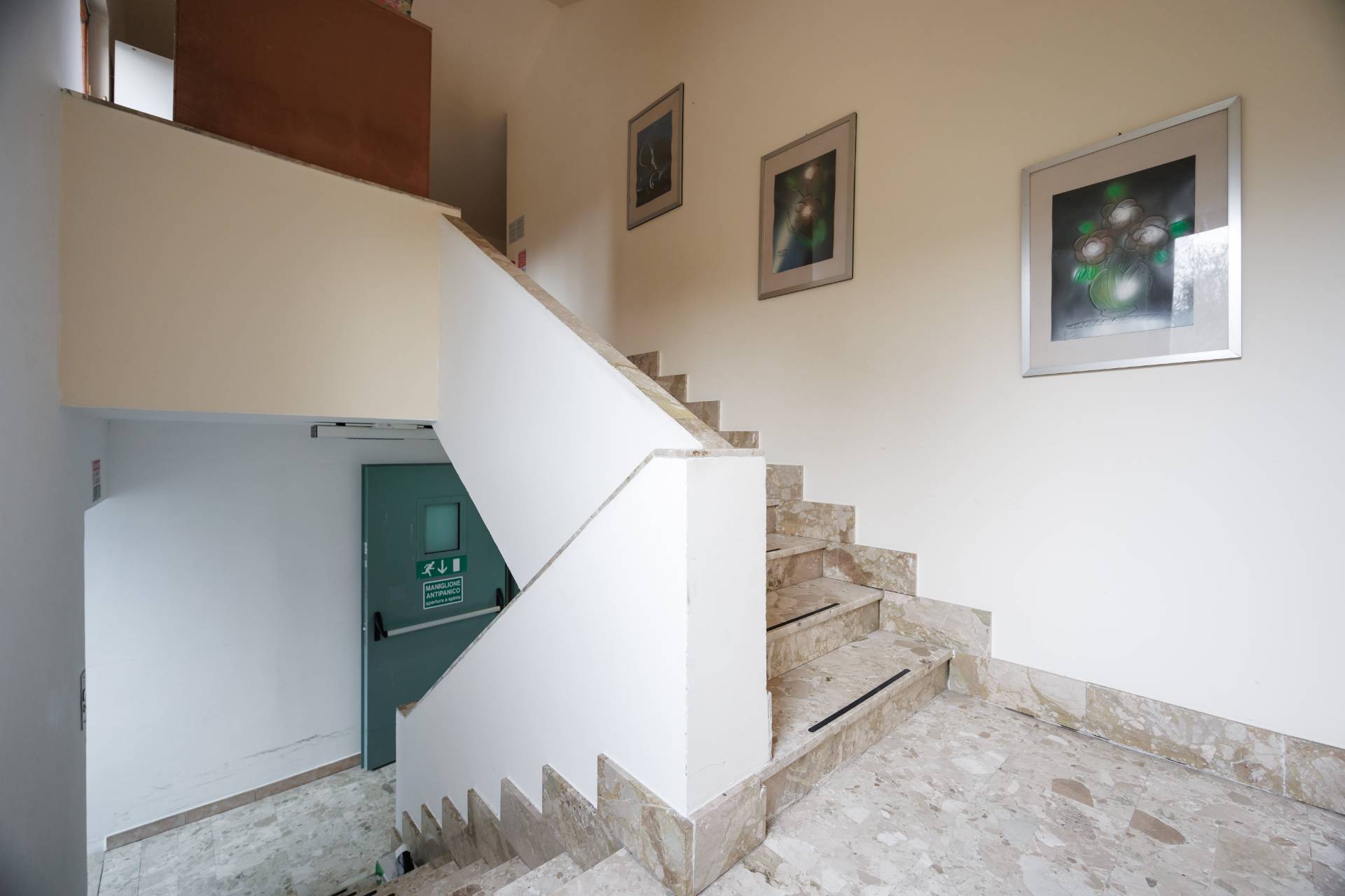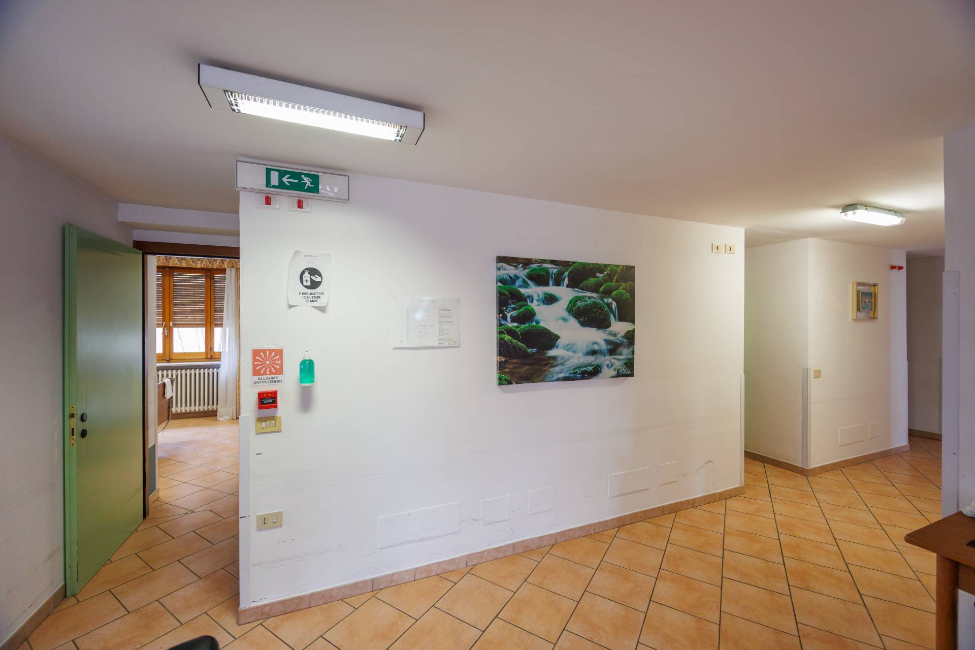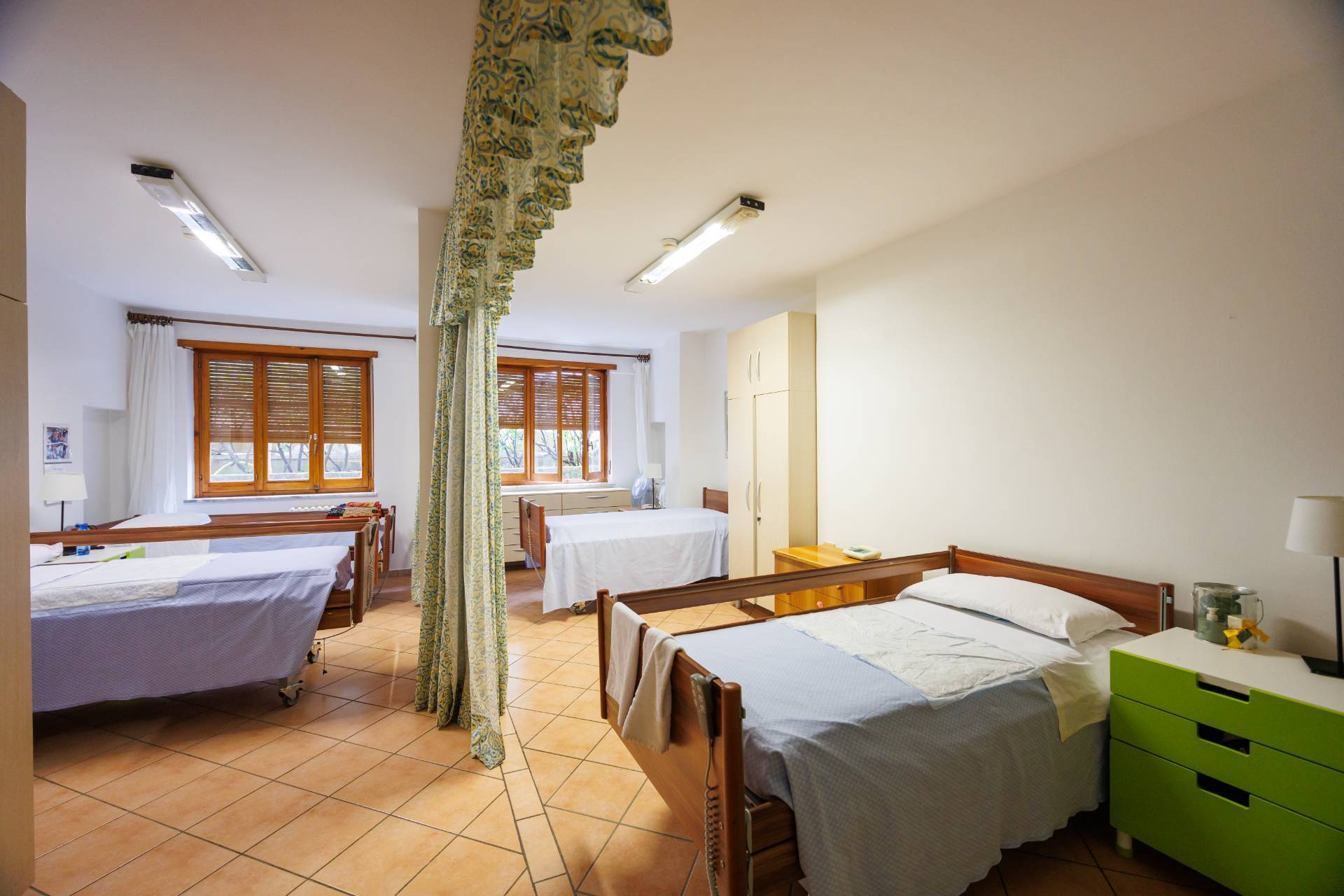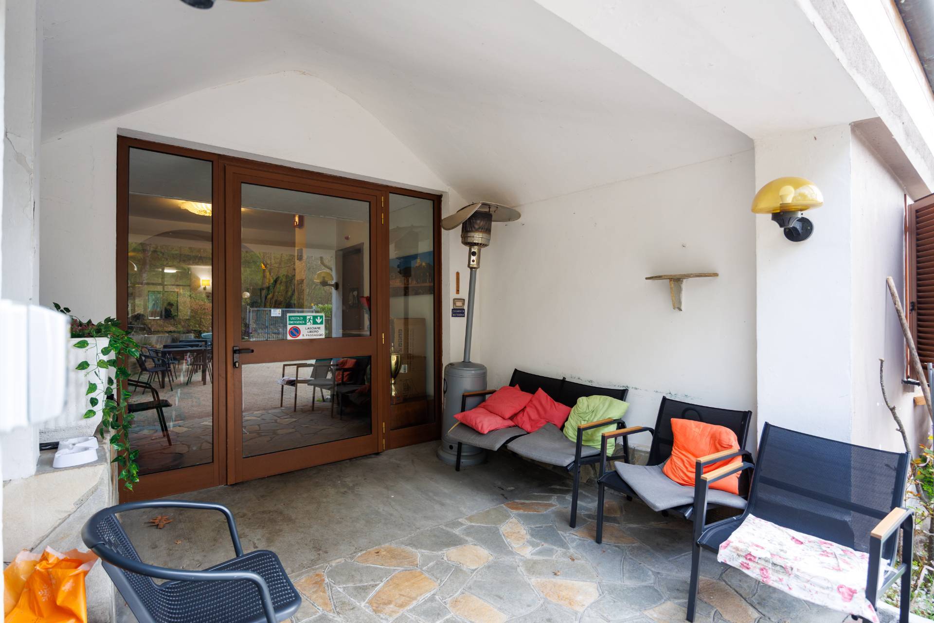 L'ingresso pedonale avviene tramite cancello elettrico direttamente nel grazioso cortile esterno che ci conduce al piano terra che è composto dall'ampio salone comune, le cucine, i bagni e gli uffici.