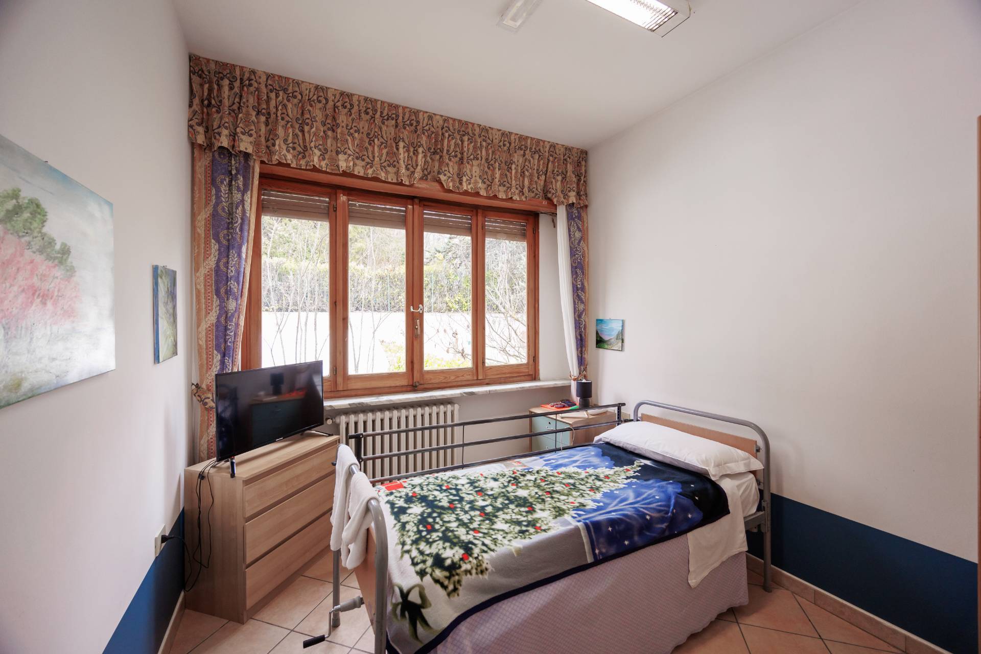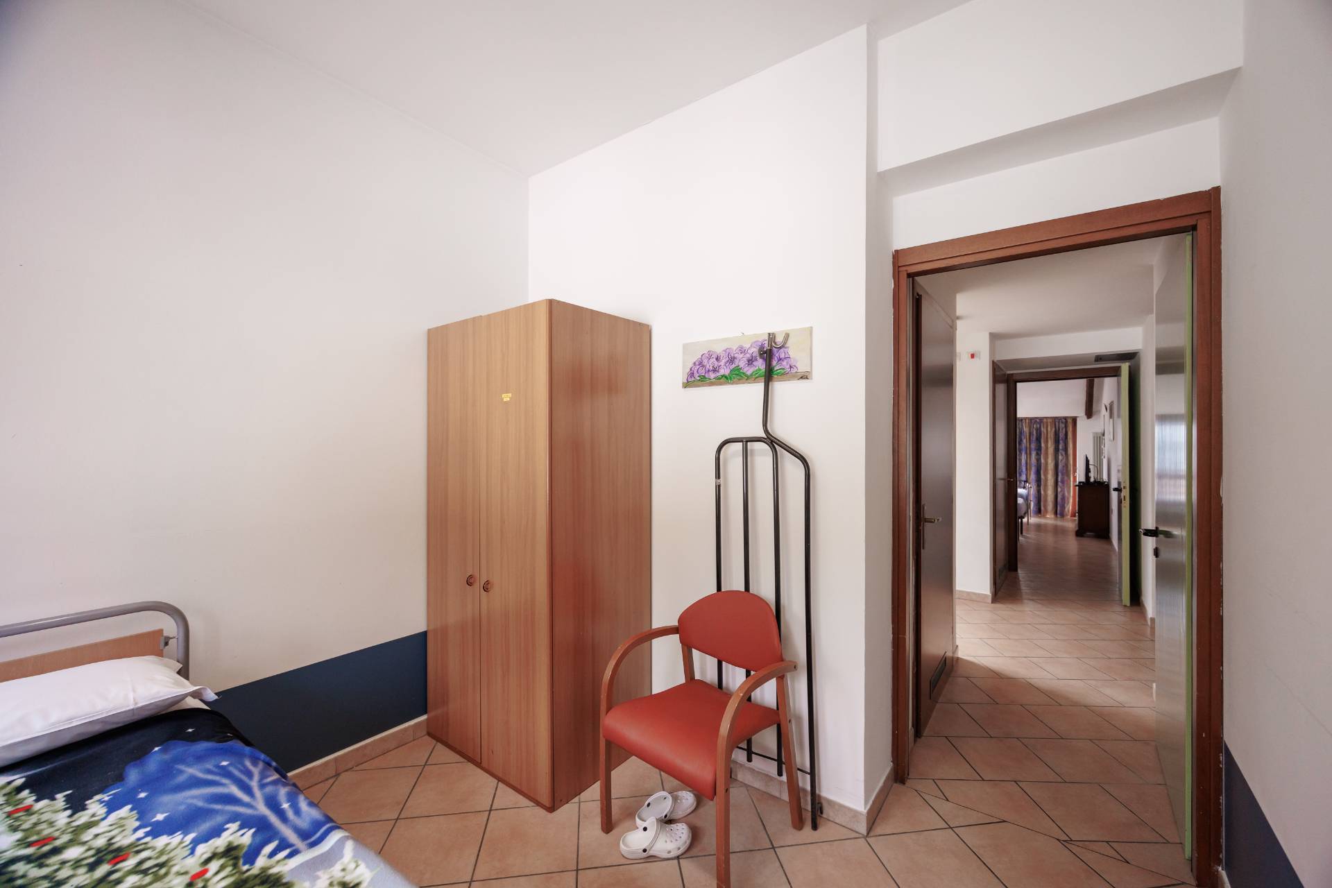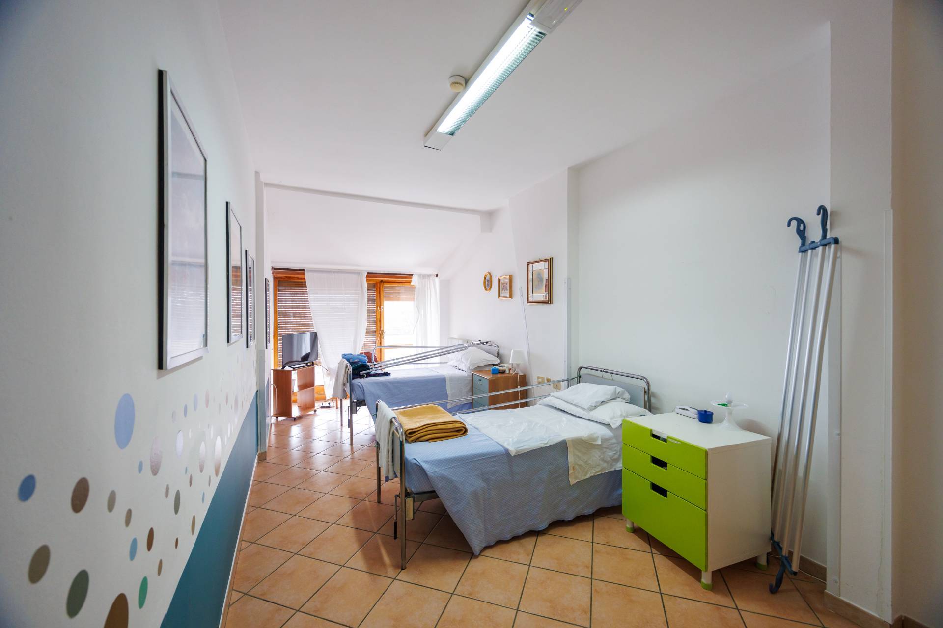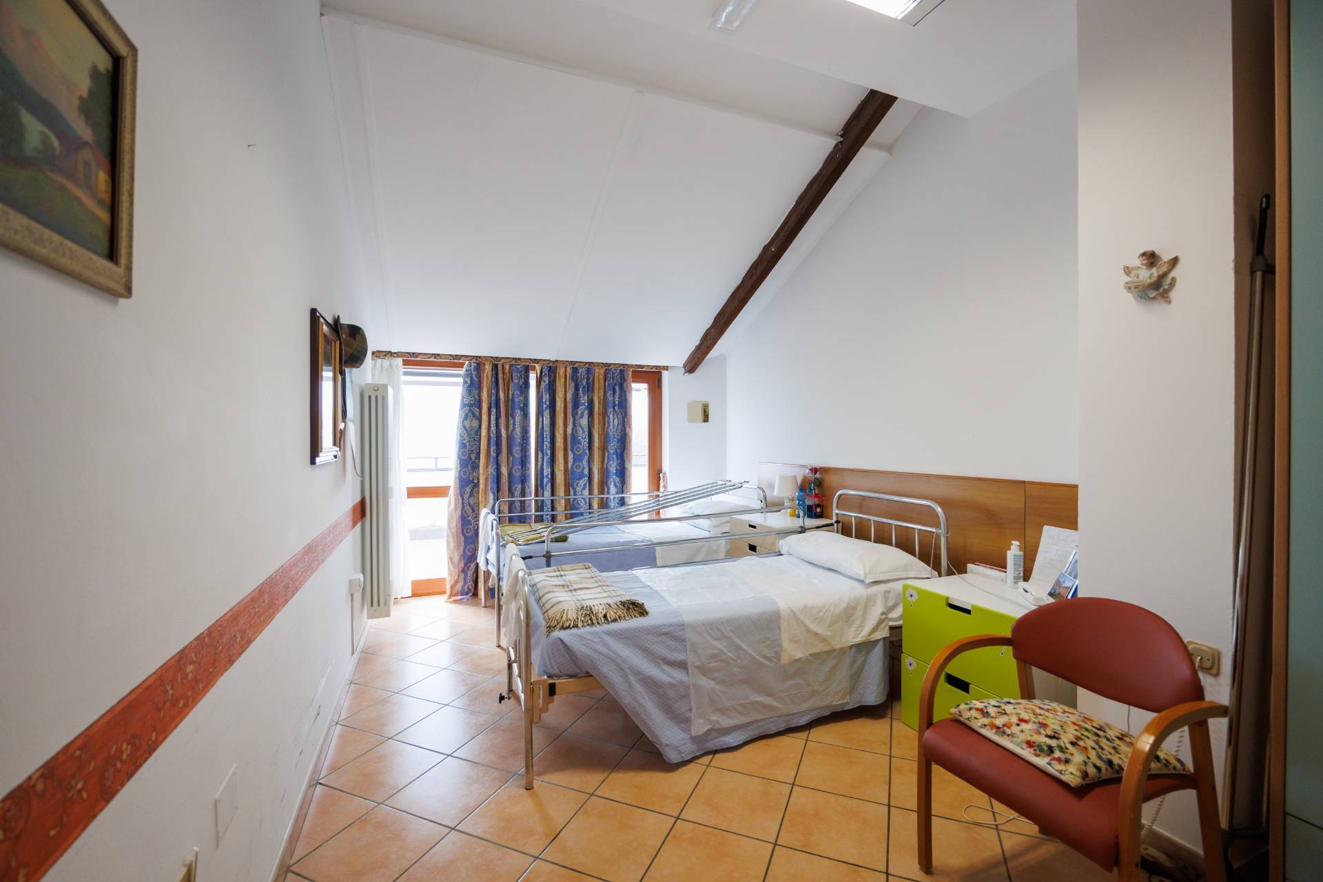 L'ingresso pedonale avviene tramite cancello elettrico direttamente nel grazioso cortile esterno che ci conduce al piano terra che è composto dall'ampio salone comune, le cucine, i bagni e gli uffici.