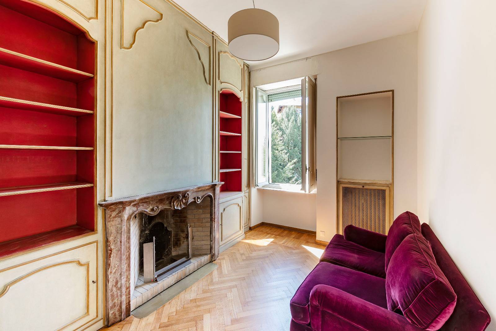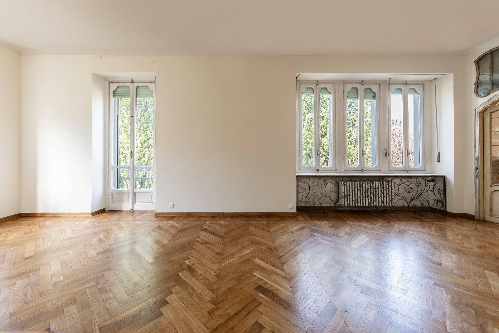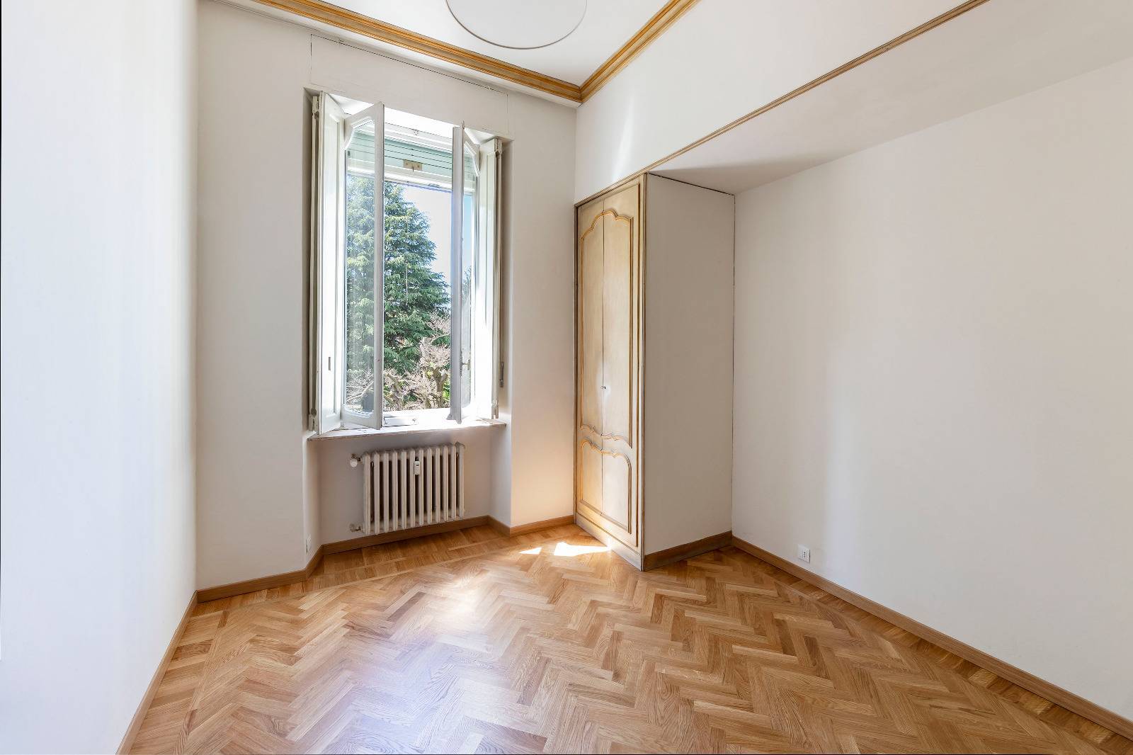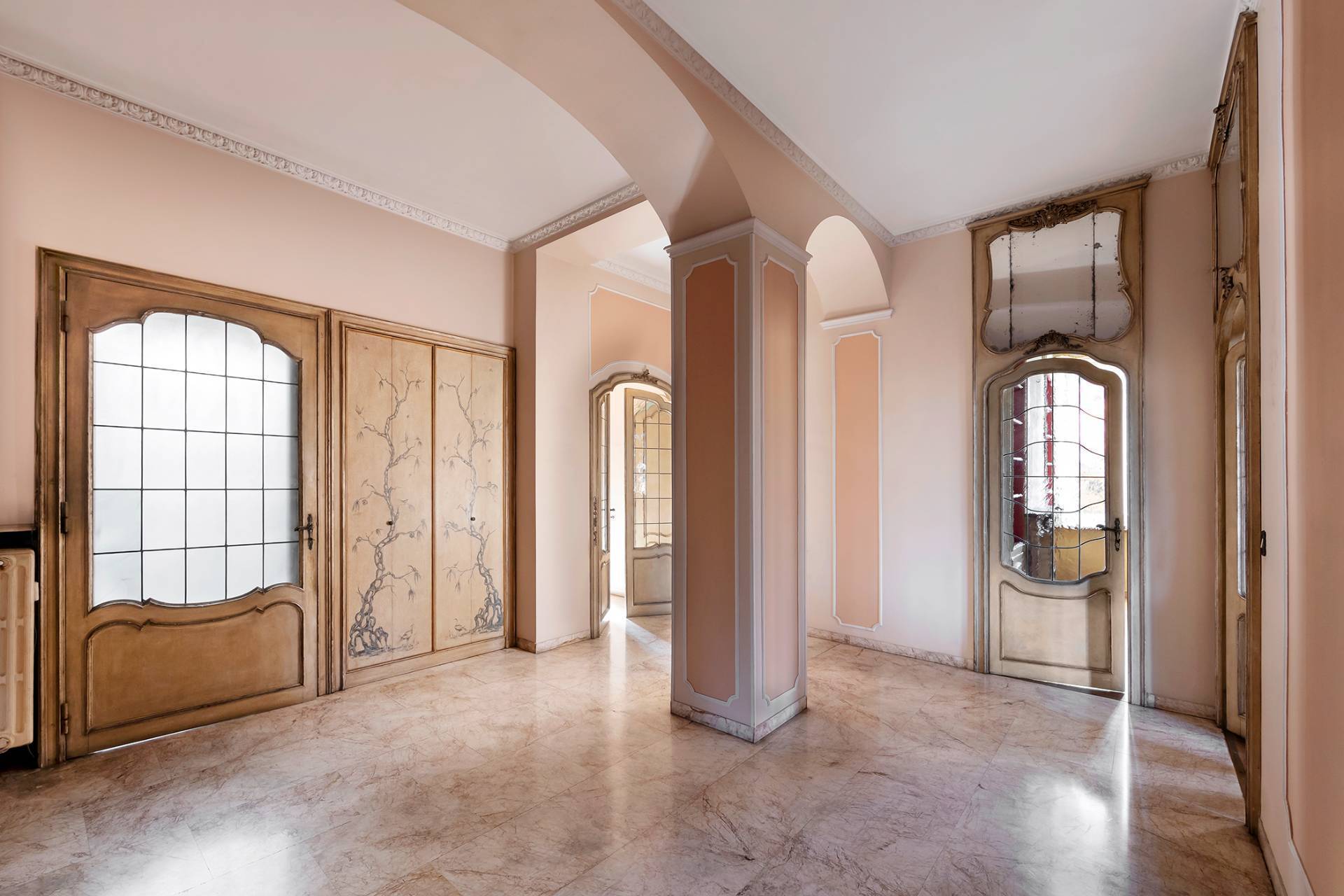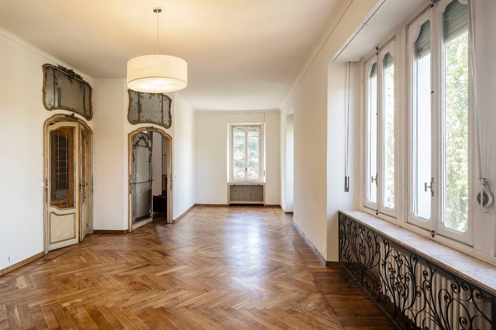 Finiture di pregio con pavimenti in marmo e parquet originale appena levigato, infissi d'epoca con doppi vetri che garantiscono comfort e isolamento.