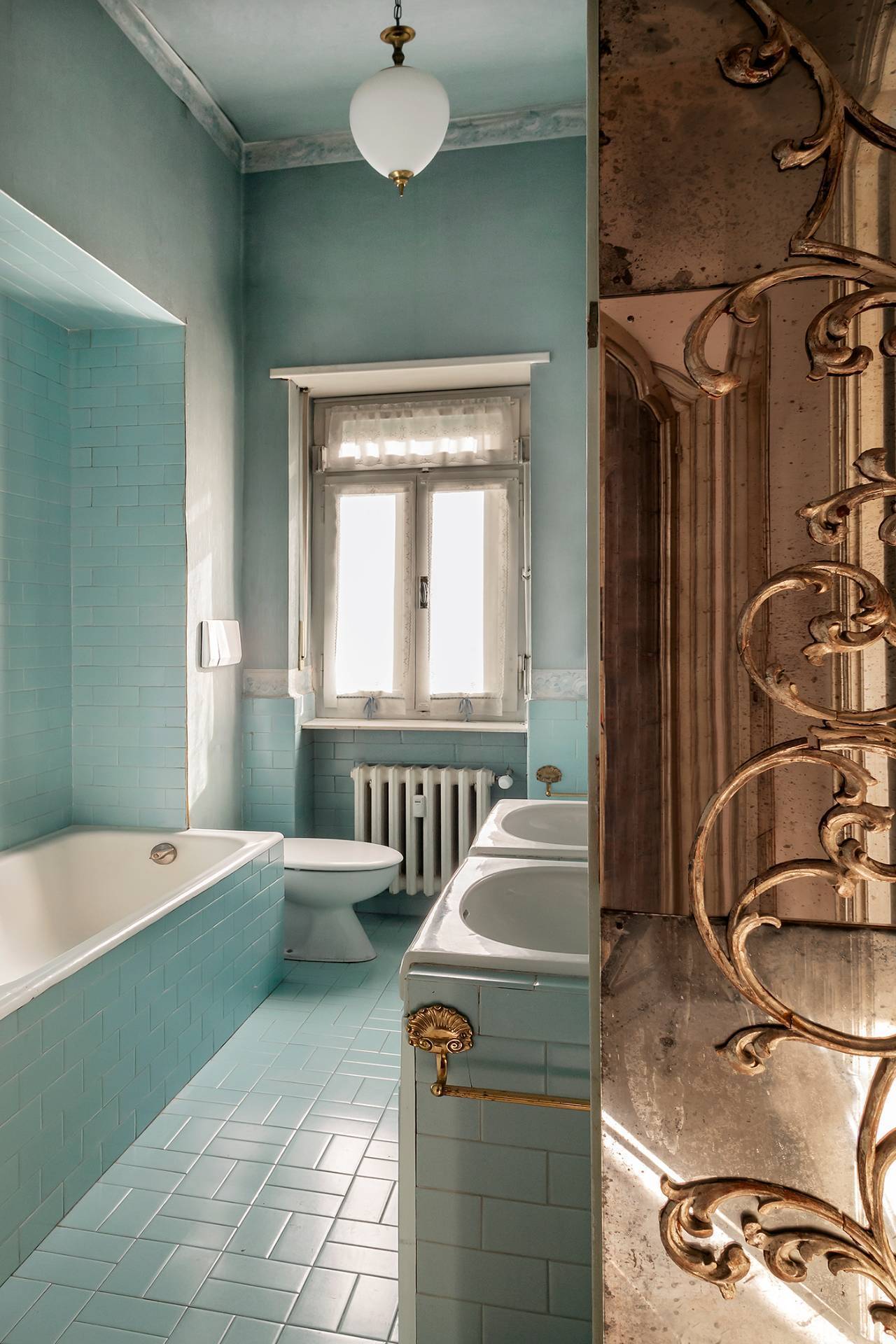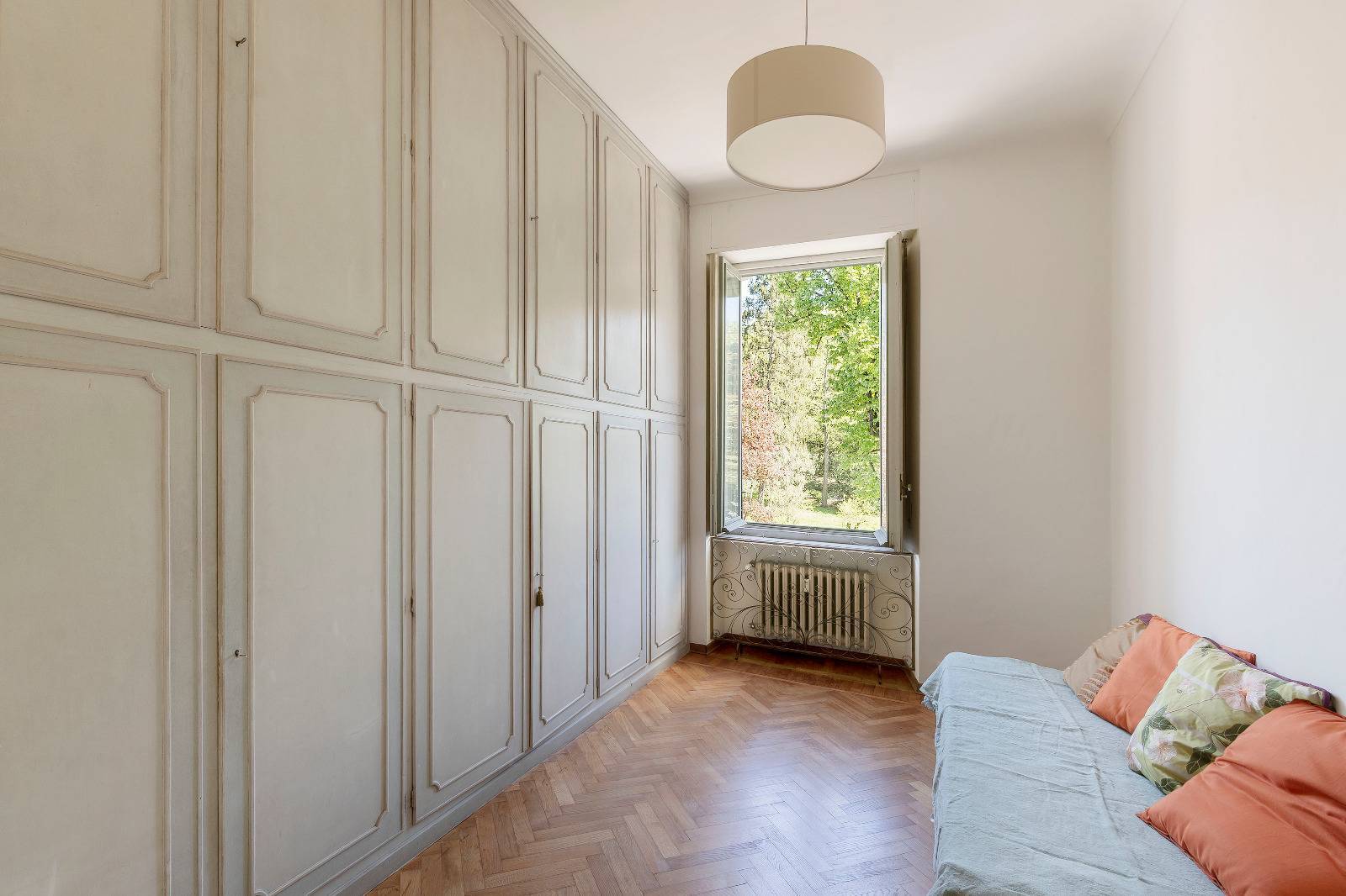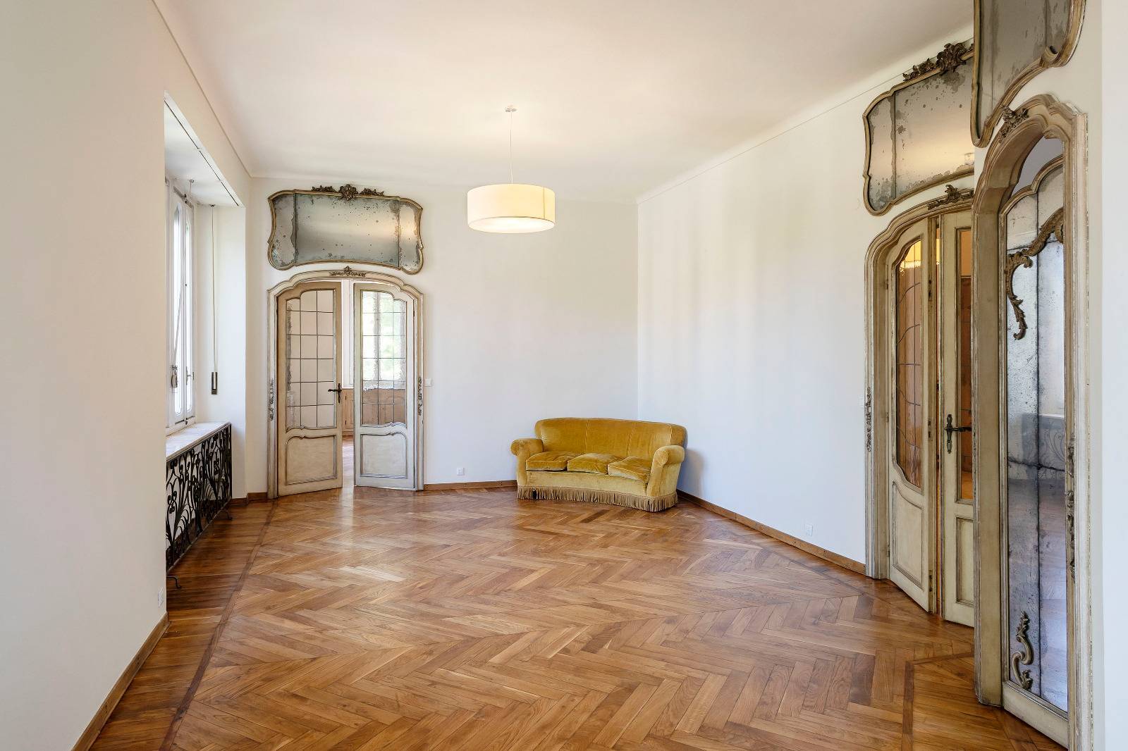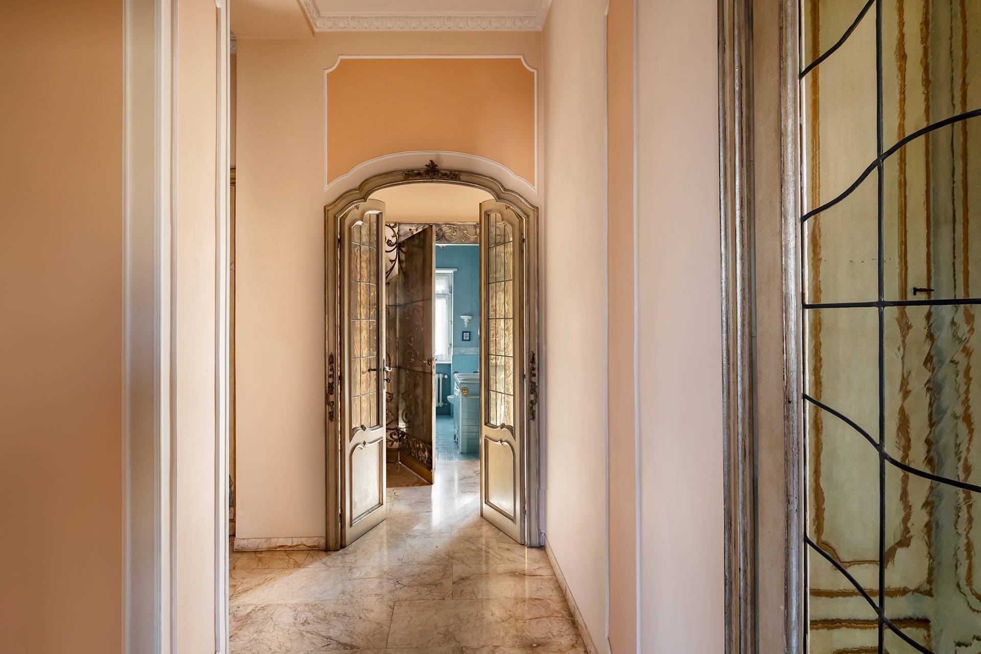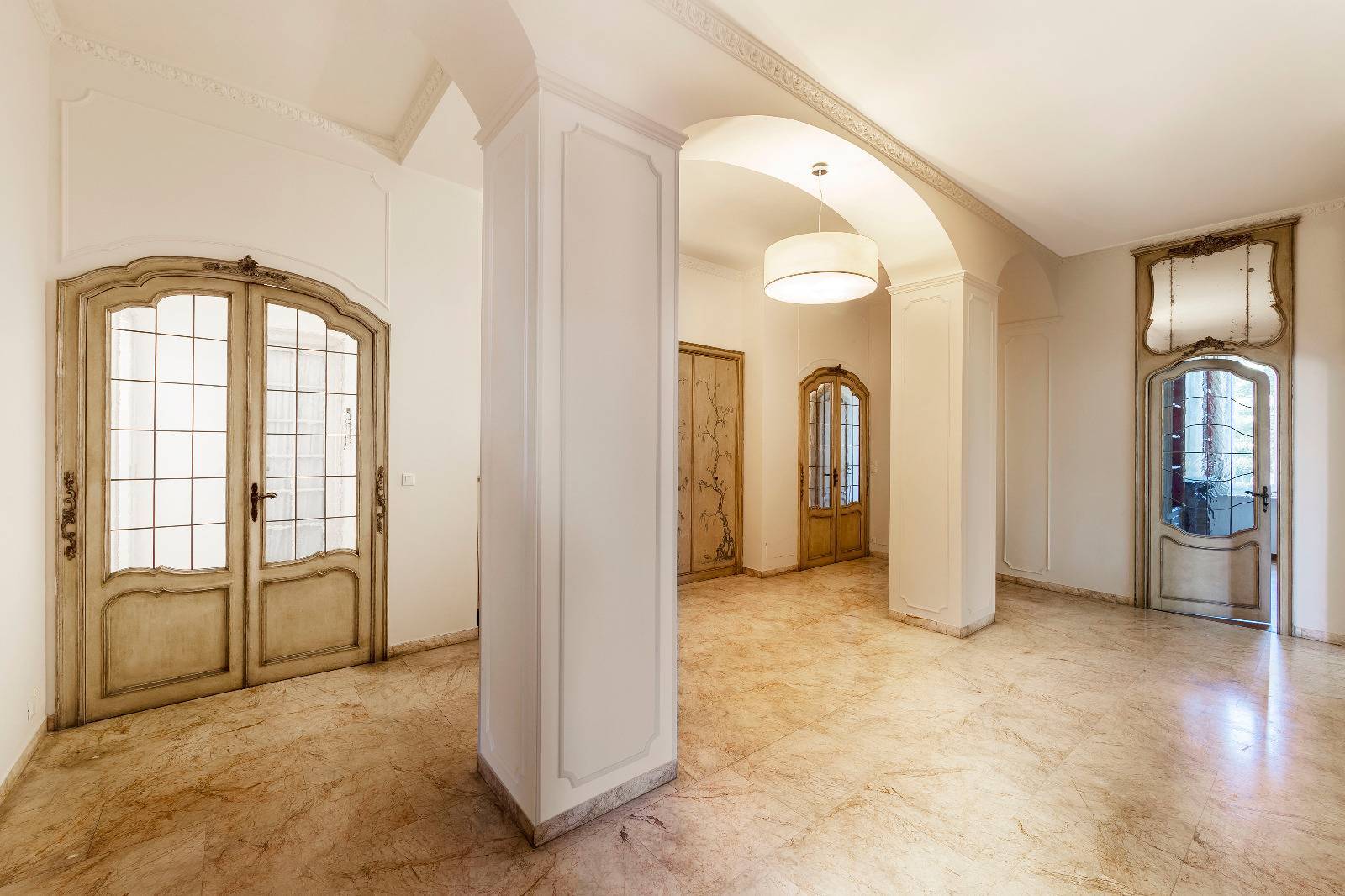 Finiture di pregio con pavimenti in marmo e parquet originale appena levigato, infissi d'epoca con doppi vetri che garantiscono comfort e isolamento.
