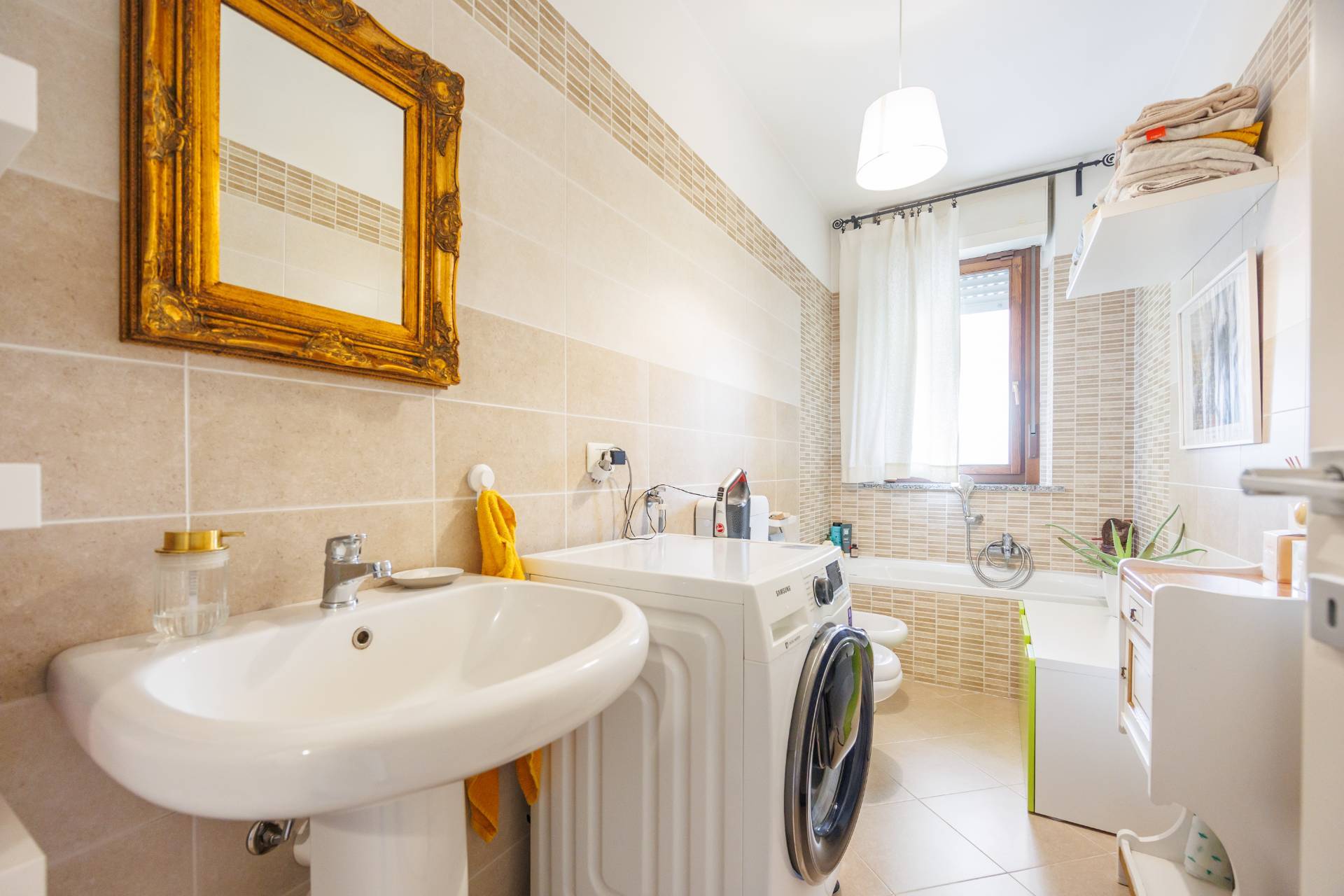 - ingresso su ampia sala doppia, con zona soggiorno/living e zona pranzo con cucina a vista; un disimpegno che conduce ad un primo bagno con vasca.