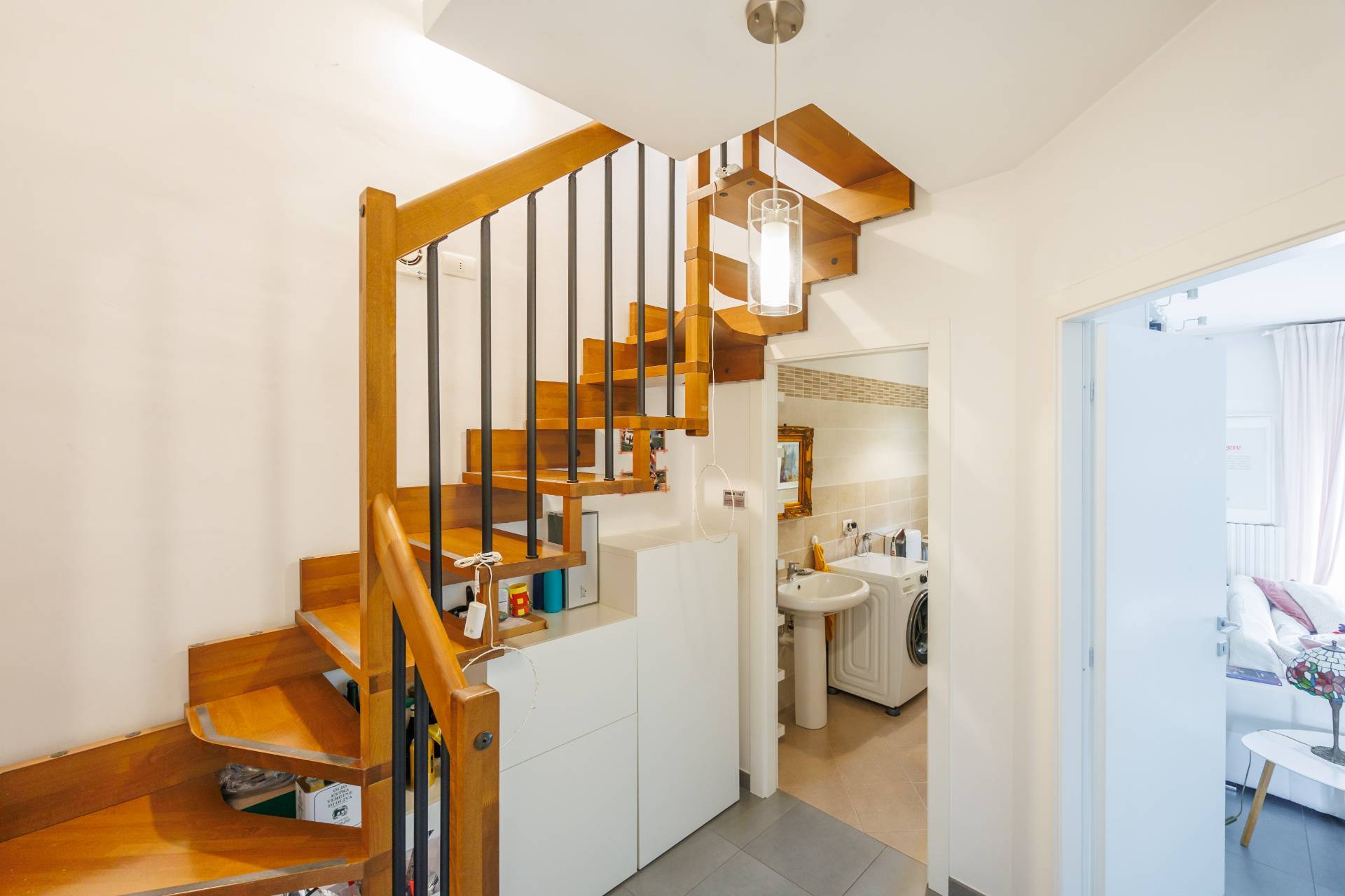 - una scala in legno collega il piano superiore, dove troviamo due camere e altro bagno con doccia;